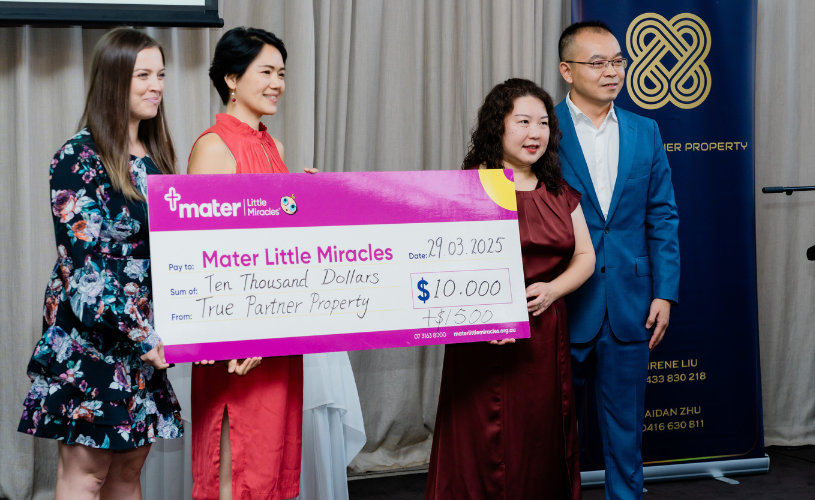 Mater Foundation is honoured to receive a generous $11,500 donation from True Partner Property, owned by Irene Liu and Aidan Zhu, in support of the Mater Little Miracles Research Centre.